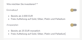 Ein Edelmetallinvestment ist bereits ab 2.000 Euro möglich. Alternativ oder auch in Kombination kann in Form eines Ansparplanes ab 25 Euro monatlich investiert werden, wodurch sich das SOLIT Edelmetalldepot ideal zum langfristigen Vermögensaufbau eignet. Die Aufteilung des Investitionsbetrages ist frei auf die Edelmetalle Gold, Silber, Platin und Palladium aufteilbar.